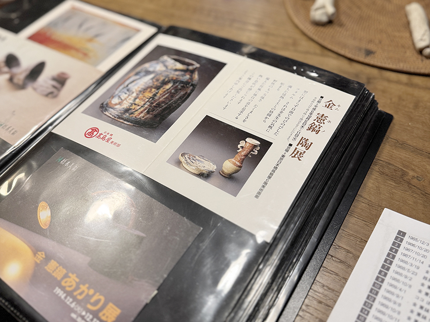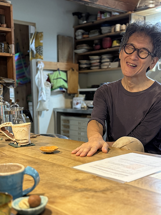 辻:陶芸家で友達とか意識してる作家とかいました? キ:鯉江良二さんかな。僕は知らなかったんだけど、職業訓練校の同期が僕の仕事場に遊びに来た時、僕が作ったのを見て「コイエリョウジっていう人がこういうの作ってるよ」って教えてくれたんだよね。どういう人なんだろうと気になって、名前をインプットしておいたら、ある日新聞記事に載ってて、それで個展を見に行ったの。それで「僕がやろうとしてることを先にやってて悔しい」って話をしたら、すごく喜んでくれて。「俺は気にしないからどんどんやればいい」って。その時見た織部がすごく良くて安かった。だけど4000円がなくて買えなくて、1000円のぐい呑みを買った記憶がある。鯉江さんの仕事は凄い気になったね。 辻:同じ時代に生きていると気になるものが同じで、そういう偶然って起きますよね。分かります。そして、それからは、ずっと個展をひたすら? キ:ひたすらっていうほど多くないけどね、まだ。最初のうちは年に1回か2回。1991年、92年ごろから増えていった。 辻:今が66歳でしょ。今後の制作についてはどんなふうに考えてますか。死ぬまで続ける? キ:まあ、作れる限り作っていきたいなと思う。 辻:時代とか社会と制作との関係はどうですか。対談の前に「今年は戦後80年」「80年たっても‥」って話がありましたけど。 キ:なんかますます豊かじゃなくなってる感じがするけどね。どんどんどんどん貧困になってるんじゃないかなと。金銭的なことだけじゃなくて、あらゆるものが。だから僕のものを求める人が増えてるんじゃないかな。特に若い人たちに。やっぱりものを作るっていうのは、そういうことじゃないのかなって。 辻:どういうことですか、分かりやすく言うと。 キ:いや、だから、そういう時、何か満たされない時に、作品と出会うことによって救われるっていうか、満たされていくっていうか。そのために作ってるんじゃないかって思うわけ。だから、表現する人たちは、やっぱり貧困になっちゃいけないわけだよ、心がね。自分が求めてるものを探っていくっていうか、探検をしていくことが大事じゃないかなと思う。自分が何を良しとしてるのかっていう。それがないと、やっぱり表現できてないんじゃないかな、と。そのクエスチョンが必要だと思う。疑問を持つこと。問いかけがアートだから。 辻:既成概念にとらわれないってことですね。最後に金沢のギャラリーの名前に付けた「ライフ」という言葉について、どんなことが思い浮かびますか。ライフには生活だったり、日常だったり、命だったり、大切なものだったり、たくさんの意味がありますけど。キムさんにとってのライフは? キ:これまでも喋ってきたけど、生活のスタイルに憧れるんじゃなくて、自分が何を求めているかを生活する中で気付いていくことが大事なんじゃないかと思う。スタイルだけ真似るんじゃなくて、探し求めた結果、あるスタイルになるってことが、特にものを作っている人には大切で、その人らしさになっていくんじゃないのかな。 辻:キムさんの話は深い!いつも刺激や学びがあります。今日は、貴重なお時間本当にありがとうございました。展覧会作品と、あとキムカフェもすごく楽しみにしてます。キムさんは、コーヒーも深煎りね!