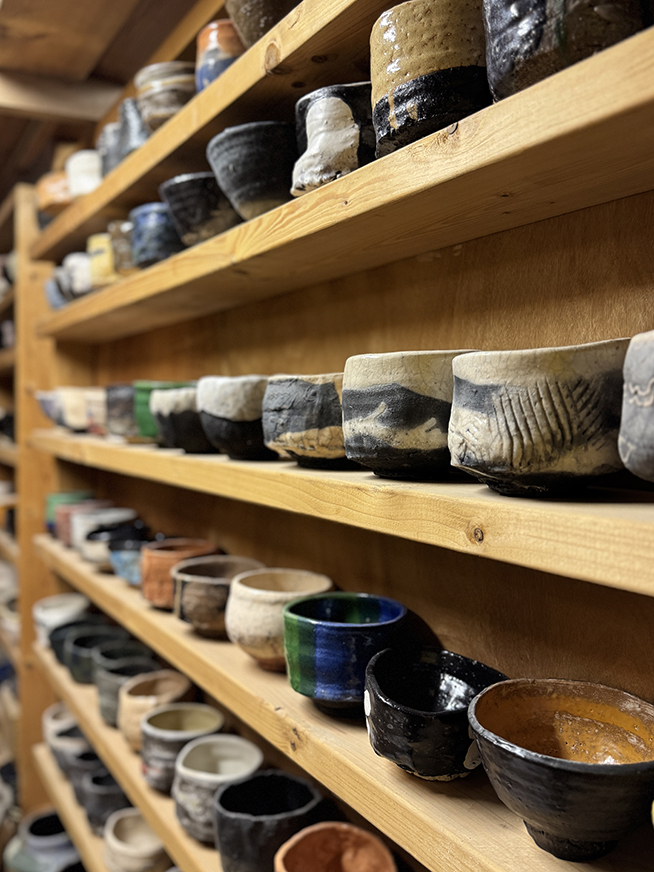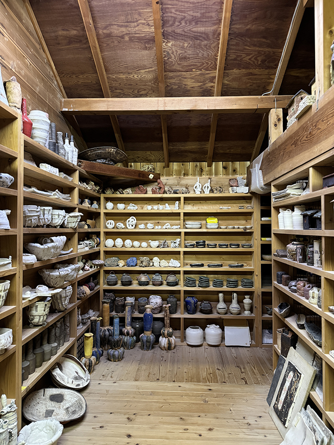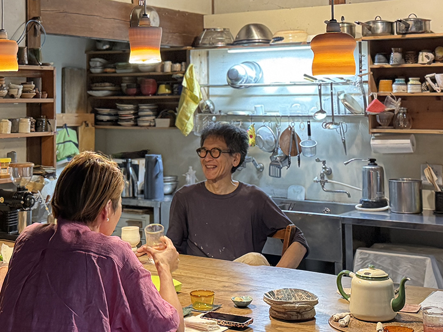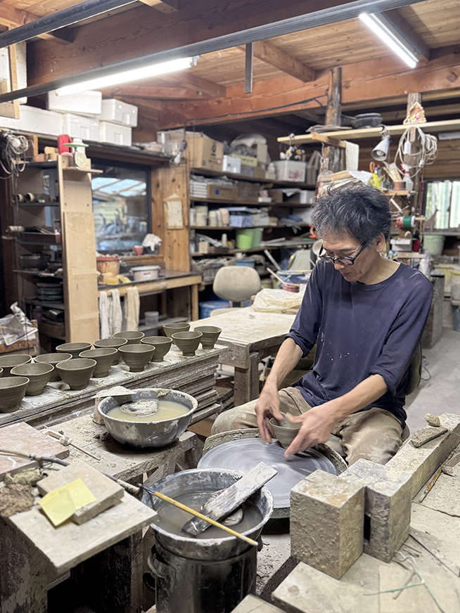 <略歴> 岩田圭介(いわた・けいすけ)1954年、福岡県添田町生まれ。日本大学芸術学部彫刻科専攻・卒業。多治見工業高校窯業科を経て表現としての陶磁器を追求した瀬戸の河本五郎氏の元で学ぶ。1983年、郷里の福岡で独立。国内をはじめ台湾、韓国、フランス、アメリカなど海外でも作品を発表。朝日陶芸展、焼き締め陶公募展などで受賞。2025年は金沢の後、蒲郡、奈良で展覧会を予定。 <旅のメモ> 初日の昼は福岡空港から車で約1時間の岩田家からさらにドライブして着いた宗像市の「こなみ」で。製麺所直営のうどん店は地元の食材を使った季節のうどんと昼呑みが楽しめる鄙の名店。夜は博多に戻って和食の「ようは」とミントを水耕栽培するピンクライトが怪しげな「MINT BAR HACCA」へ。翌日は人気のパン店DACOMECCA(ダコメッカ)、I’m donut?(アイムドーナツ)で行列。1000円で揚げたての天ぷらが食べられる「ひらお」でコスパの高さに感激。 <編集後記> 昼酒が入ってもあまり多くを語らない岩田さんを横から美智子さんがフォローしながらの小1時間。口数が少ないのは嘘が嫌いだから、誠実さの故と受け止めた。本当は理屈などいらない。ずっと見ていたい、触れていたい作品がそこにある。その幸せを改めて思う。(鈴木)