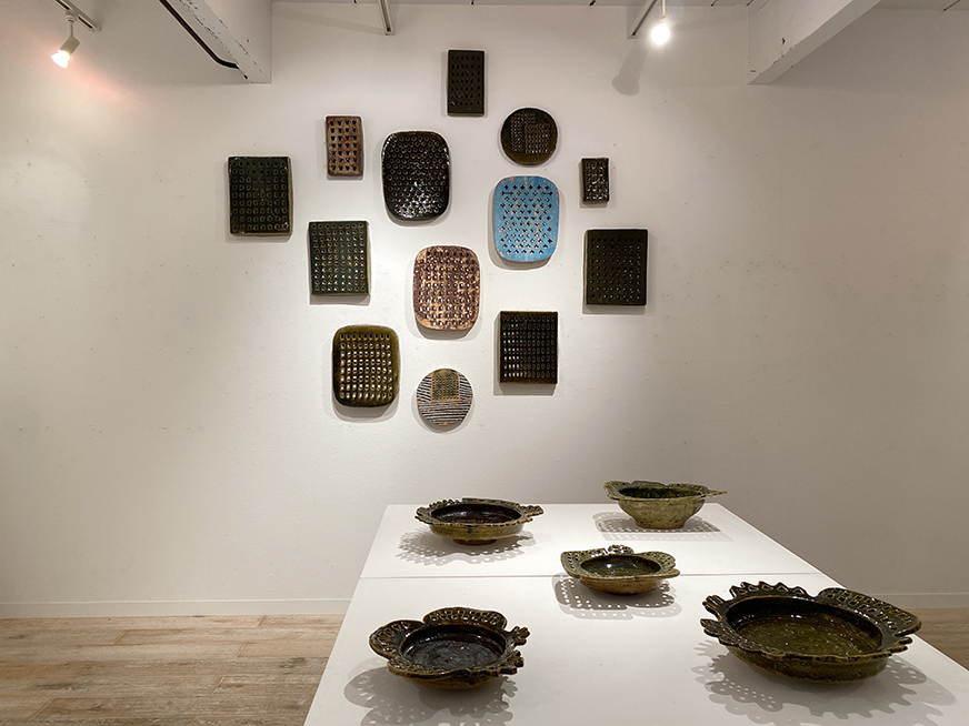 T:井山さんと私って同世代じゃないですか。正確には井山さんが一つ下なんだけど。(笑)今みたいにインスタなんかがない時代、展覧会の案内が来るたび「ああ、頑張ってるなー」って思ってました。DMを見ると私も励みになって、もうちょっと頑張ろうって。そんな意識をする相手でした。 I:いえいえ。私より1歩も2歩も前ですよ。扱う素材が違ってよかった。(笑) T:それでちょっと古い話からになるんですけど、井山さんが今の作風、型にスライスした粘土を入れて焼くスタイルを始めたのはいつ頃だったんですか? I:前職がギャラリーの仕事で、その頃に陶芸教室に通ってて、ろくろをやってたんですね。それから職業訓練校に行って。やっぱり独立したときはろくろで作りたいと思ってたんですけど、結婚した相手が高校から大学までずっとろくろを専攻してて、家にろくろが1台しかなかったので、2人で一緒には轢けないから、それで自分ができることが型だったんですね。それからもう型をやり始めて。 その後、ギャラリーさんから展覧会の話をいただいて、ろくろでって言われたから「1年ください」ってお願いして、練習したんですけど、やっぱり高台は削れないし中心は出せないし。べちょべちょの土が手に付くのも苦手で。でも、もともとプロダクトとか建築とかの方がやりたかったので、そういう意味では今、型の仕事でこういうデザインしたりっていうのは向いてたのかもしれない。