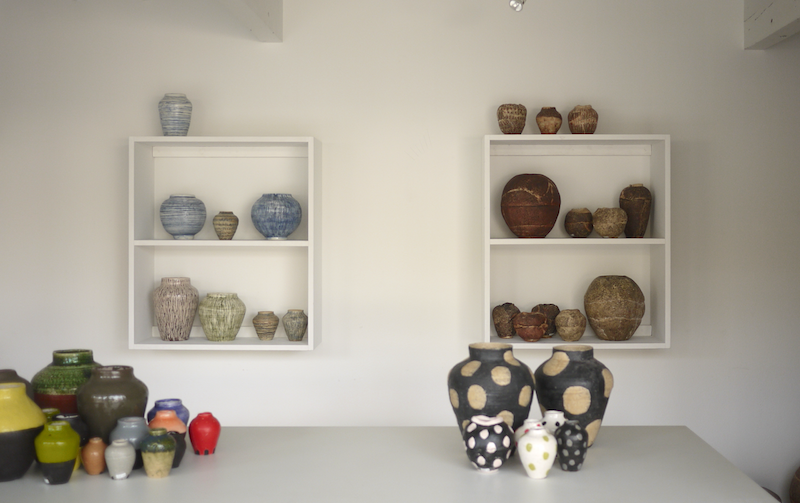 辻:窯は焼き締めの時と白磁を焼く時では違うんですね。知らなかったです。 中:そのままでは使えないんですよ。たとえ使えても自分の思い描いた雑器とは違ってくる。薪窯は自分で規制しないと上品というか位が高くなっちゃう。雑器にならない。観賞用になっちゃうんです。 辻:薪窯だと付加価値が付いちゃうんですかね。 中:薪の力は凄いですよ。引き出しをうまく使い分けて調合しないとできない。油断してたら凄いところにいっちゃう。だから自分の着地点をしっかり知ってないといけない。 辻:李朝白磁も、もともとは雑器じゃないですか。今は美術工芸品として美術館に陳列されるようになっていますが。 中:貫禄ありますよね。雑器じゃないですよ。まあ安宅コレクション(大阪市立東洋陶磁美術館の中核)が特殊なんですけど。あれは普通の暮らしの中では見れない。でも李朝を作りたいんじゃなくて、健やかな、ややこしくない、華美じゃない、自然と溶け込むようなもの。韓国の焼き物とかアフリカの彫刻とか、どこか人工的じゃないもの。そういうのは日本や中国の焼き物にはない感じがする。土器に近いかもしれない。 辻:李朝時代のモノは、いわゆる作家が作ってるわけじゃないですものね。 中:名工はいたと思うんですよ。工房があって。王朝の窯もあったし。でも自由さというか、自然というか、人間だけ独立してあるんじゃなくて、何かと一緒になってるのってやっぱり最高に素敵というか。目指すのはああいう大きなものがいい。 辻:民族性もありますよね。韓国は大らかだし明るい。 中:物によっては螺鈿とか緻密なのもあるけど仕上がりはやっぱり大らか。中国みたいに人間離れしてないですよね。