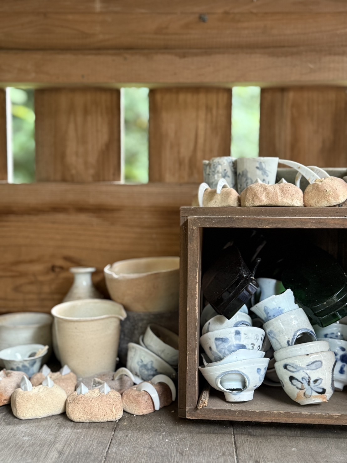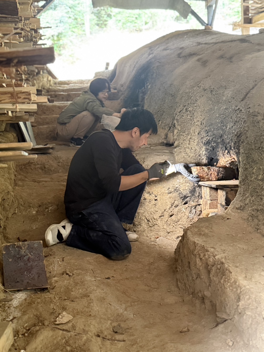 山本:そう、身体を壊して、1週間ぐらい入院して。でも結局回復しなくて片方の耳は今でもほぼ聞こえないんです。それで自分で釉薬も作るんですけど、それまで買った原料がどこから来てるか分からない。とりあえずそれを全部一から自分で把握したい、ってところからまた始まるんです。一からやり直そうと。 辻:すごいリセットですね。 山本:もう体が拒否してましたから。 辻:ものづくりって理想と現実をいかにやりくりするかですよね。経済的なことも含めて。 山本:だから急には無理だから徐々にです。もう一回磁器の始まりについて知りたいと思って今度は唐津に行くんです。磁器の始まりは唐津だから。 辻:原点回帰ですね。それでどこかの作家の所に勉強に行きましたか? 山本:梶原靖元(かじはらやすもと)さんの所に行きました。僕の新たなキーパーソンです。物を見たらもうすごい、素晴らしいんですよ。地味なんだけど、昔の焼きものの良さみたいなのがそのまま出てて、主に素材なんですけど。今の唐津と全然違って、土窯で。 辻:また弟子になりたいと思った? 弟子は嫌いだったはずだけど。 山本:(笑)通い弟子みたいな形で、週1ぐらいで手伝いに来ていいですかって。地道な作業を当たり前に積み重ねていく感じに接して、自分でも石を採ってきて土にしたり。まだ自分の窯を持ってなかったから、唐津にいる矢野直人(やのなおと)っていう友人の窯まで行って焼かせてもらって。それが5年ぐらい続いたかな。 辻:それでいよいよ2020年に自分たちの窯を作るんですね。 山本:ずっと土地は探してました。 辻:薪窯ができて、作るものに変化はあった? 山本:最初はそれこそ唐津とか初期伊万里のような言葉通りの写しみたいな作品。それまで白磁の型打ちで、ちょっとフワッとした感じだったのが、ぐい呑みを片手に語っちゃうみたいな方向に転換しました。(笑)