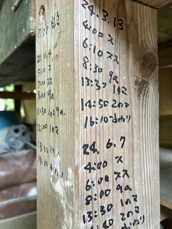 辻:一番最初にしたのは。 中:敷地にいっぱい立ってた木を切ってもらって、その木を整理してたら犬の散歩で通りがかったおっちゃんと知り合って。その人がまた大阪から移住してきた大工さんで、手伝ってくれることになったんです。 辻:すごい偶然ですね。 中:一緒に製材所に行って、どんな木を選んだらいいかコーディネートしてもらって。それで掘っ立て小屋で製材所から来た木を刻んでくれたんですよ。 予算がないのに「いいよ」って。その間に僕は地面を掘って基礎を作って、基礎ができたらこれで建つわっていう感じ。 4月に引っ越してきて、8月に棟上げ。とんとん拍子です。そこから土壁の下地を編むのに2カ月ぐらい。で11月、やっと土を塗ったかな。年明けに鉄骨を組んで1月から窯を作り出したんですけど、窯は最初から薪窯と決めてました。 辻:どうして薪じゃないとダメなの。 中:第一希望、薪。第二希望、なし。できなければ諦めて就職するつもりでした。そこに妥協はなかった。学生時代から結構、陶芸の産地とか作家さんの工房とか見てきたんですけど、薪窯は生活と一体なんです。ガスとか電気だと切り替えてる感じがする。自宅と会社みたいな。 辻:仕事と生活を一致させたかったんですね。 中: うん、目指してるのはそっちだったので。雑器を作るのと庭で野菜を作るのも同じ。それしかできない。それがガッチリ重なるのがいいなと思った。陶芸をやりたいというより生き方の中の選択が粘土だった。他の選択肢はないんですよ。